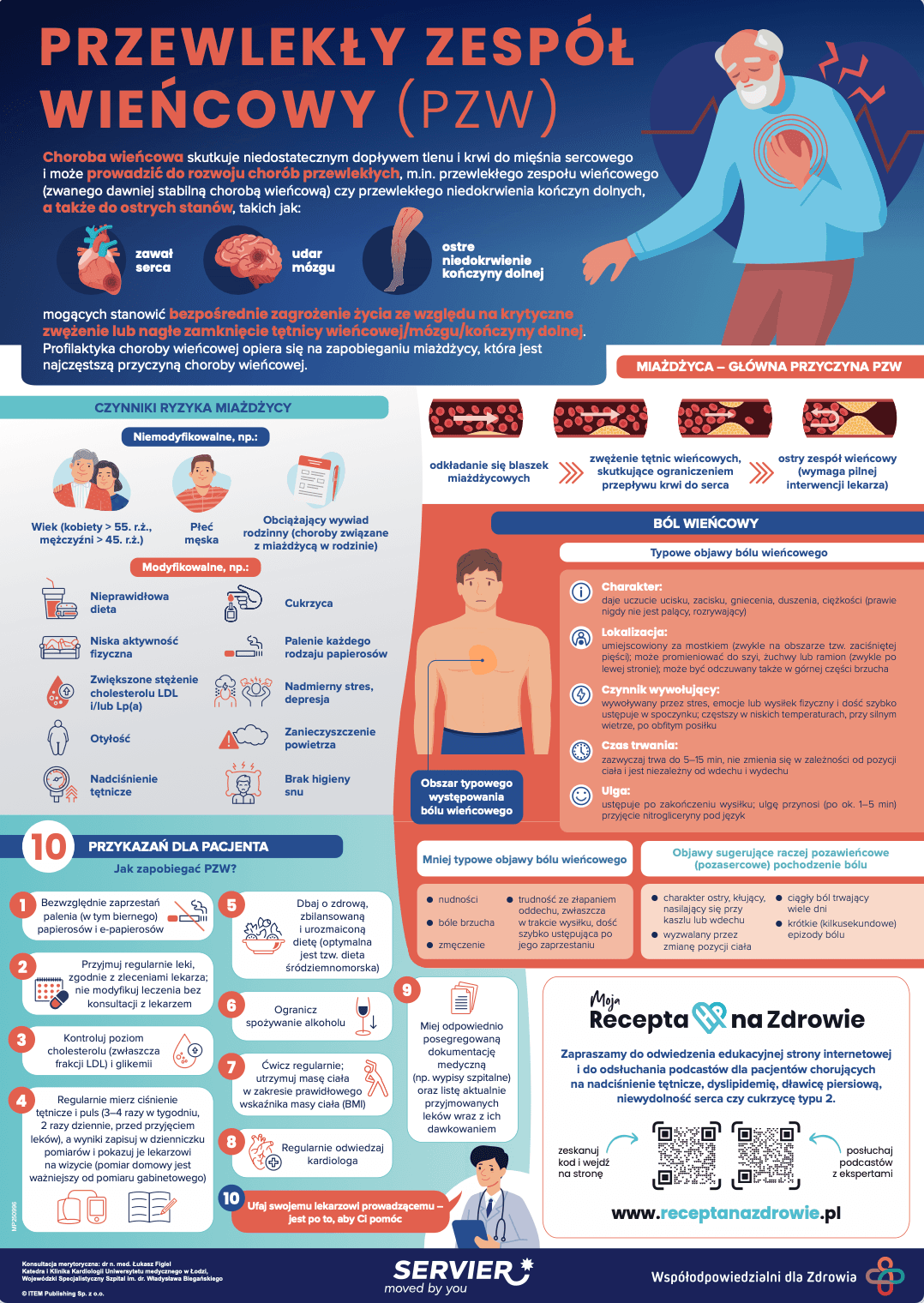 Plakat to praktyczne wskazówki dotyczące przewlekłego zespołu wieńcowego na jednej, czytelnej grafice. Powieś plakat na lodówce i miej wszystkie najważniejsze informacje w zasięgu wzroku!